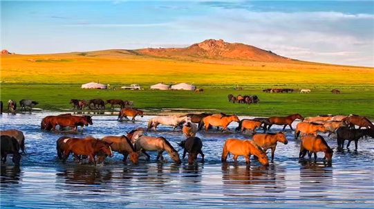 海拉爾出發(fā),驅(qū)車前往【呼倫貝爾大草原】穿越草原帶您進去草原腹地,感受一代成吉思汗發(fā)跡地。呼倫貝爾草原一眼望不到邊,微風(fēng)吹過都能聞到清新的青草泥土味,清澈透亮的藍天與朵朵白云,綠草如茵,野花遍地,牛羊成群,點點氈房。牧民騎著馬兒飛馳而過,綁在敖包旁的神幡隨風(fēng)起舞。在草原上與親友追逐、奔跑、嬉戲、拍照、打鬧,無拘無束,隨心所欲。這里的自然、淳樸、原始足以將身心的疲憊一掃而空。驅(qū)車深入草原70多公里到達【莫日格勒河】人稱天下第一曲水。莫日格勒河是蜿蜒在呼倫貝爾大草原上的一條曲折的河水,兩岸芳草遍地,鳥語花香,蝶飛蜂舞,處處馬嘶羊咩。這里也是《嘎達梅林》、《快樂大本營》、《爸爸去哪兒》、《尋龍訣》、《狼圖騰》等眾多影視節(jié)目的拍攝地。后驅(qū)車沿著草原小路到達【莫日格勒河至高點】眺望莫日格勒河九曲十八灣的美景,看那彎彎曲曲的河流在草原上流淌著,在這里感受那草原河流的秀美。游動草原上的牛群、馬群、羊群,很多潔白的蒙古包盡收眼底,構(gòu)成一幅完美的草原風(fēng)景畫。